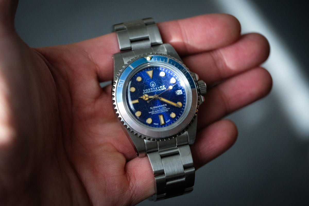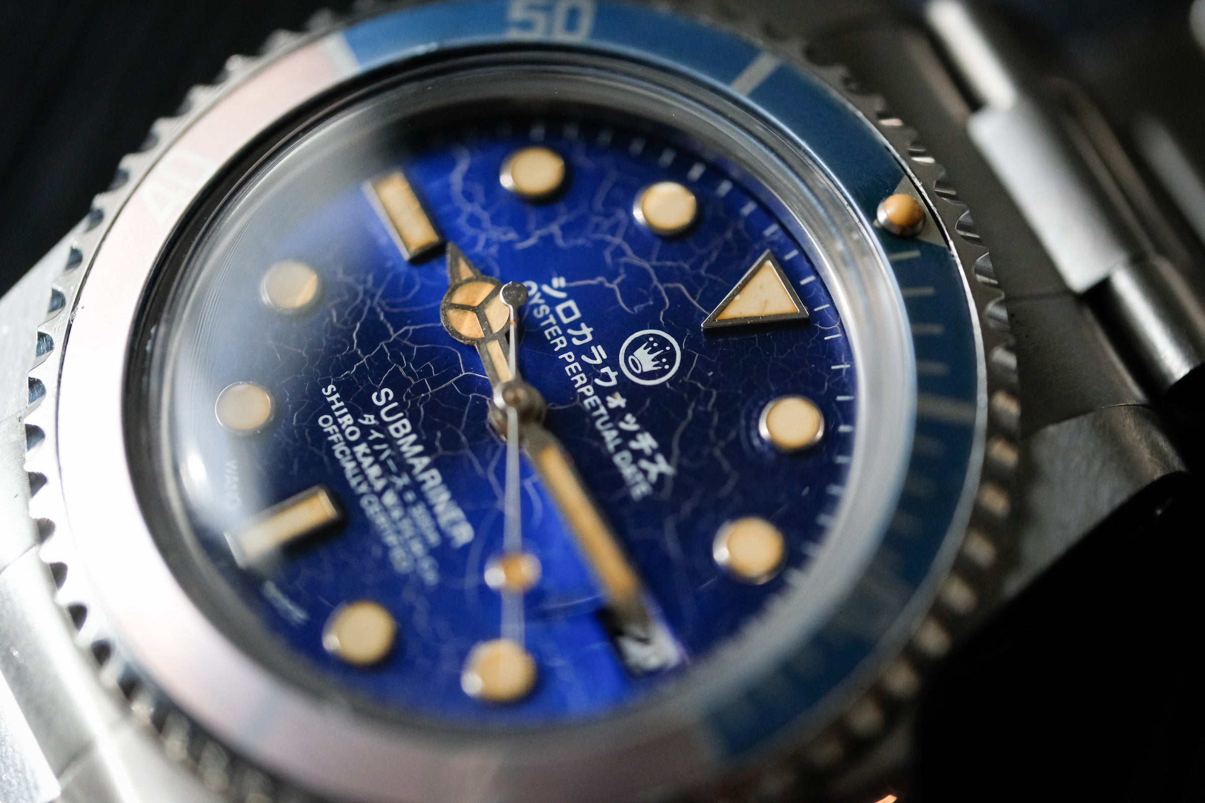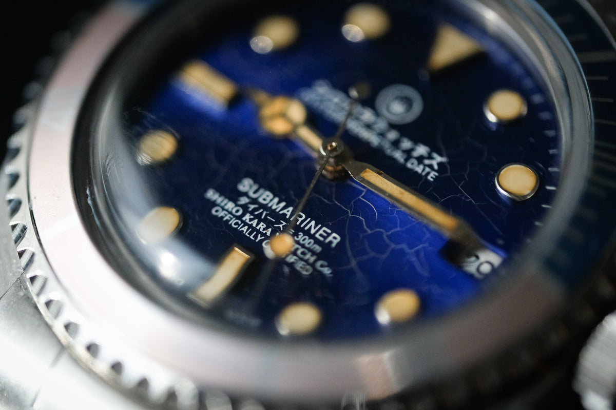 This timepiece showcases a meticulously handcrafted spider-dial effect on a Blue Sunburst dial, complemented by a rich patina across the dial, case, bezel, bracelet, and clasp. The result is a truly distinctive and eye-catching aesthetic, embodying the authentic Shiro Kara Vintage watch style.