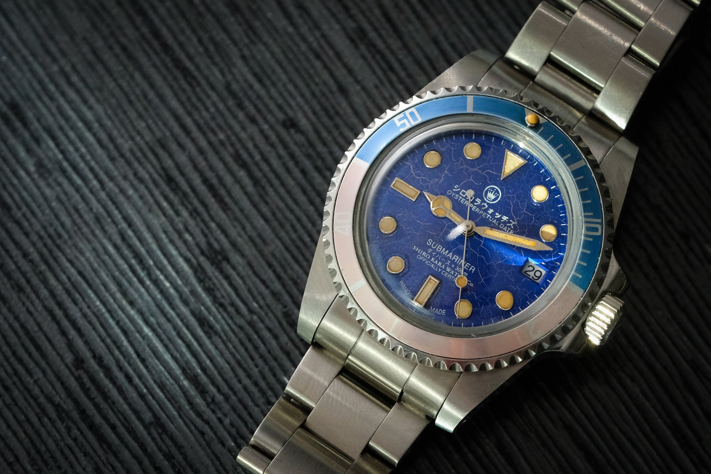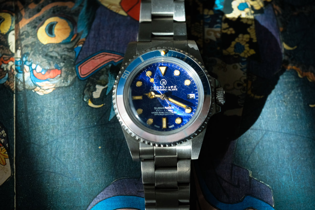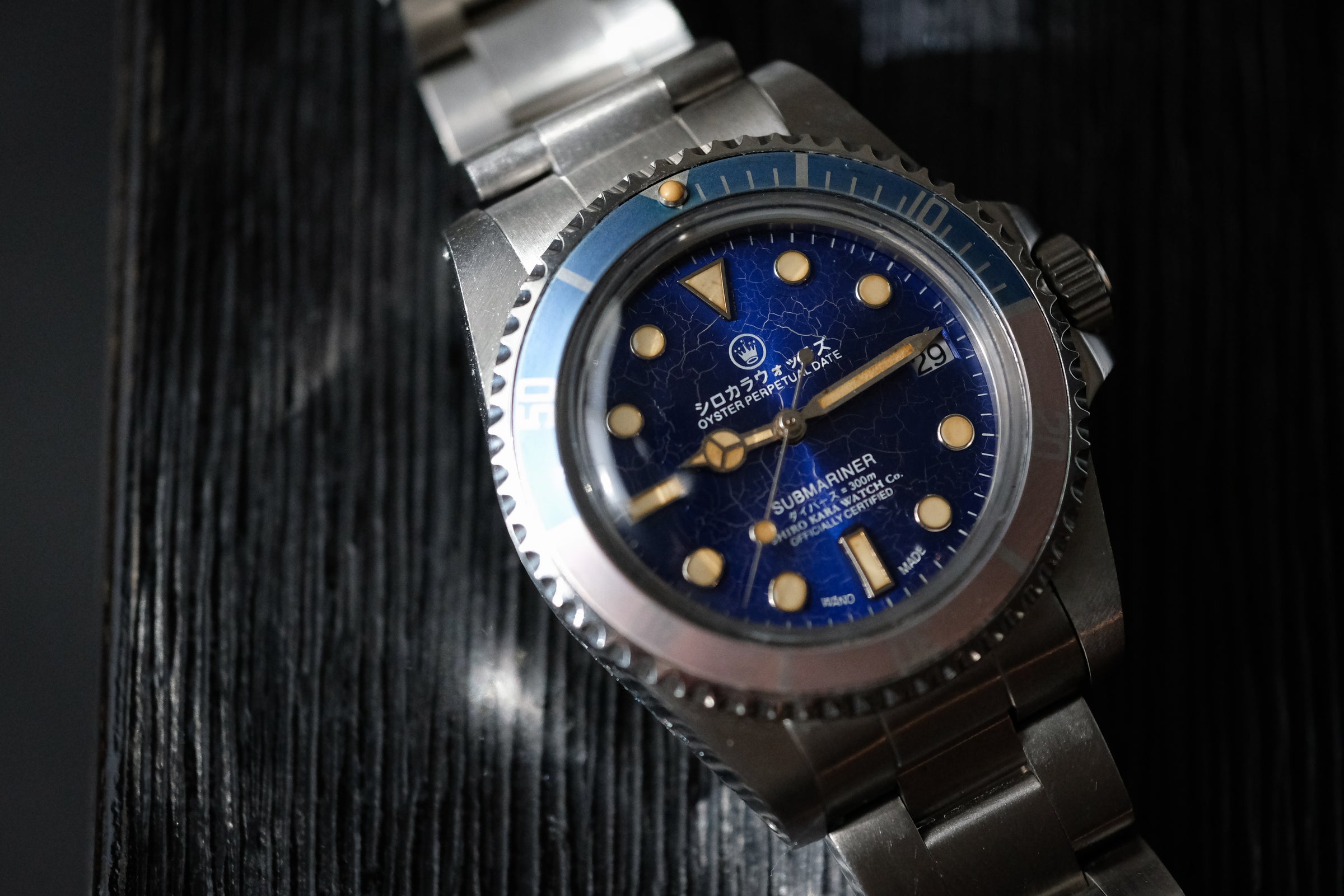 This timepiece showcases a meticulously handcrafted spider-dial effect on a Blue Sunburst dial, complemented by a rich patina across the dial, case, bezel, bracelet, and clasp. The result is a truly distinctive and eye-catching aesthetic, embodying the authentic Shiro Kara Vintage watch style.